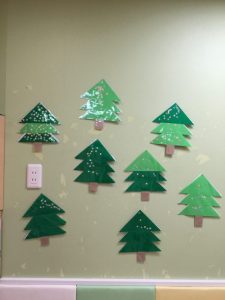 ツリーは折り紙を三角に折り、シールを貼りました![]()