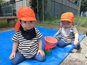 日陰でお砂場玩具に興味津々になったり、お砂場に座り込み遊んだり