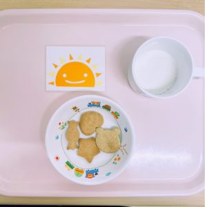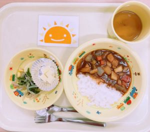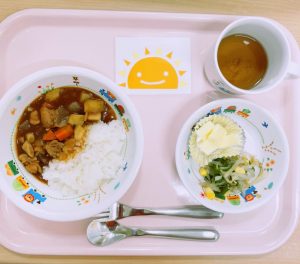 ※給食ができあがると、「いいにおい、なんのごはんだろうね~」とかわいい声が聞こえてきました。においを感じるのも五感の発達につながります♪
