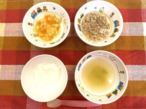 【離乳食後期】エネルギー137kcal たんぱく質4.5g 脂質1.5g 粥 味噌汁(キャベツ) 鶏...