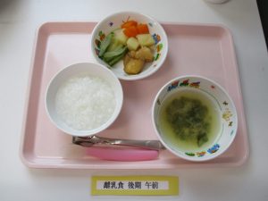 2018-07-13 7月13日(金)お給食 Category:給食ピックアップ ★幼児食★ ・ごはん ・わかめとキノコの味噌汁 ・魚のからあげ ・ポテトサラダ ・チンゲン菜のおかか和え ★離乳食★ ・おかゆ ・味噌汁 ・煮魚 ・ゆで野菜 ・煮物