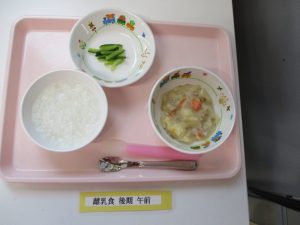 2018-07-18 7月18日(水)お給食 Category:給食ピックアップ ★幼児食★ ・ごはん ・カレーシチュー ・カラフルサラダ ・枝豆 ★離乳食★ ・おかゆ ・クリームシチュー ・スティック胡瓜