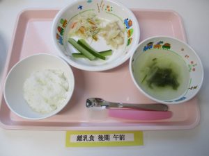 2018-07-24 7月24日(火)お給食 Category:給食ピックアップ ★幼児食★ ・ごはん ・たまねぎとわかめの味噌汁 ・西京焼き ・炒めビーフン ・野菜の梅和え ★離乳食★ ・おかゆ ・味噌汁 ・スティックきゅうり ・煮魚 ・炒めビーフン
