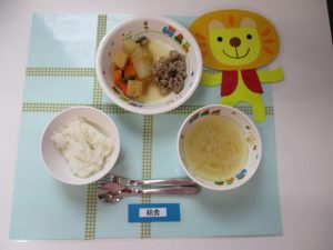 ★幼児食★ ・ご飯 ・味噌汁 ・おでん ・野菜炒め ・黄桃缶 ★離乳食☆後期食★ ・おかゆ ・味噌汁...