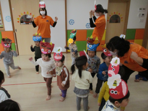 作った?を身につけて、節分会スタ~ト~![]()