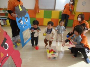 最後に、赤鬼&青鬼めがけて豆(ボール)まきをしましたよ![]()