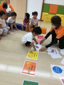 たくさん食べたフルーツカードを同じ色のカードの上に置いていきますよ。