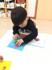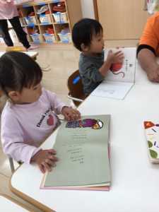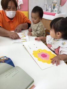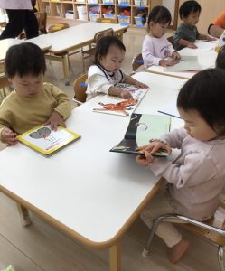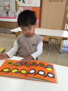 2歳児になると絵本を見ながら自分なりにセリフを考えて、ブツブツ言いながら楽しむ姿も見られて新たな発見の時間にもなりました