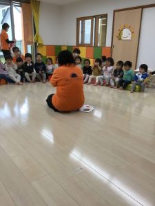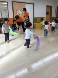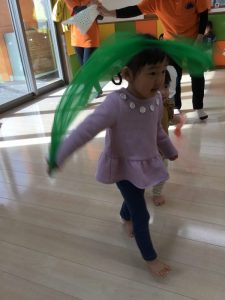 ピアノの高さやリズムに合わせた風を表現します。高くて速い音は旋風の様な風だったり、低くてゆっくりの音は嵐の様な風だったりと色んな表現をして楽しんでいましたよ🎵