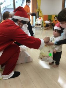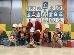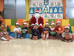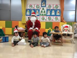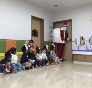 クリスマス会の日に突然現れたサンタクロースに、みんなビックリ(ビックリし過ぎて涙がポロリのお友だちも・・・)