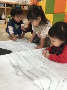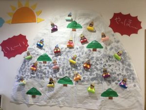 「ソリ遊び」のワードに興味津々の子どもたちだったので雪が降り積もったら作品に負けないくらい楽しくソリ遊びを体験させてあげたいなぁ〜と思っています。