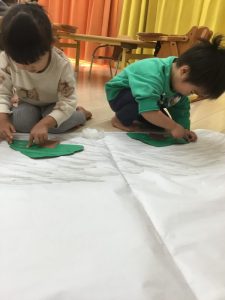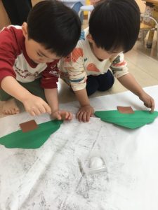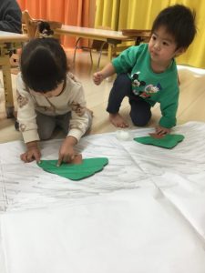 山に木を作って貼ってくれたのは2歳児さんの頑張りです