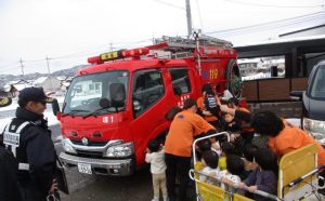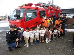 職員は訓練に対して…子どもたちは大好きな消防車に対して…(笑)