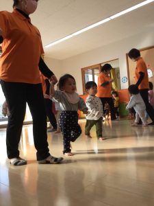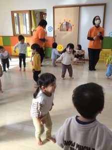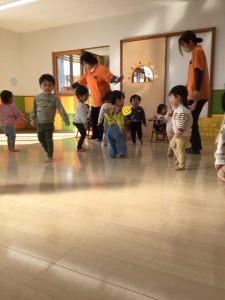 音楽に合わせて歩きますよ。音楽が止まったら先生が出したカードの動作をします。