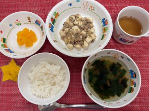 今日の給食は、麻婆豆腐でした!「おかわりください♪」と言う子が多く、たくさん食べてくれて嬉しかったです♪スープの具の野菜も残さず食べていました♪