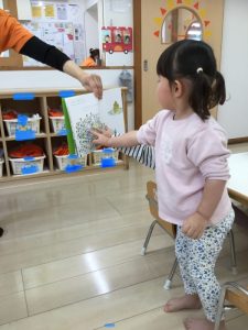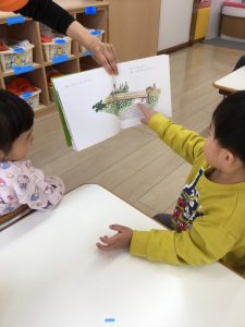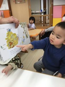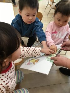 月刊絵本も春らしく明るい色合いの絵本が届き、子どもたちは「きれいだね〜」と春の優しさを感じながら和やかな表情で絵本を見ています