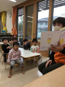 午後おやつの後に読んでもらう月刊絵本をとても楽しみにしている子どもたち。1ヵ月に3冊の絵本に出会い、1年に換算すると36冊もの絵本と触れ合う事が出来ました