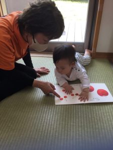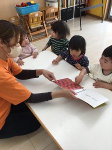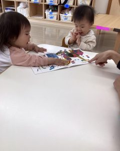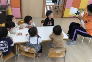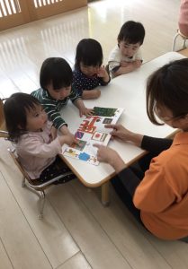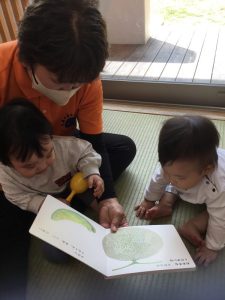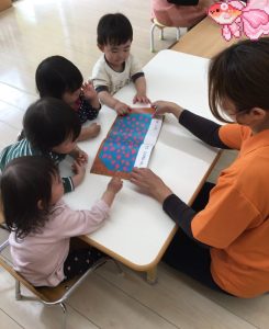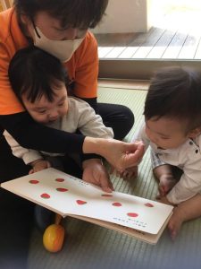 0歳児の子どもたちが読み合う絵本は「赤ちゃん絵本」と言われる本です。赤ちゃん絵本は①背景は基本「白」②繰り返しが多くシンプル且つクリアという2つの特徴があります。本来、絵本は1対1で楽しむ為に作られたものですが、保育園では、なかなか難しいので、子どもたちみんなに見える様に配慮して読み合いを楽しんでいます![]()