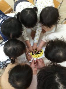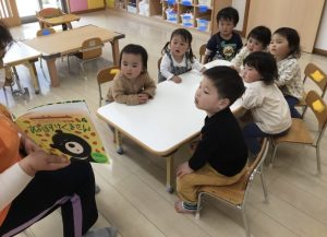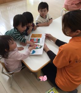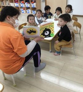 今回は、子どもたちが、いちばん落ち着いて過ごせるクラスの先生と一緒に月刊絵本を楽しんでいる様子をお伝えしようと思います。