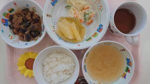 ご飯 味噌汁 なすとひき肉のケチャップ炒め ポテトサラダ パイン缶