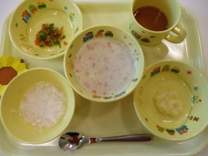 粥 チキンのシチュー いんげんのサラダ りんごすりおろし