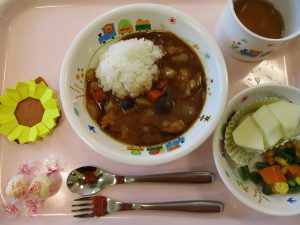 ご飯 チキンのハヤシシチュー いんげんのサラダ チーズ りんご