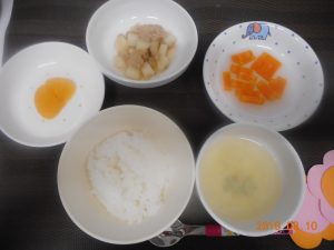 軟飯 味噌汁 ツナとポテトの煮物 ゆでにんじん みかん缶