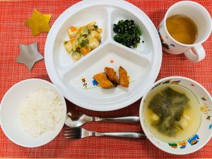 ◎給食の様子 今日は、特別な誕生日メニューでした。鶏の唐揚げもおいしいーっと嬉しそうに食べていました...