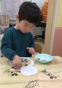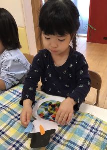 雪だるまのお腹にテープを貼って、セロファンを飾り付け🎶