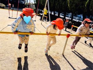 鉄棒では、りんご組のお友だちは腕の力も強くなり、上手に身体が持ち上がるようになりました👏