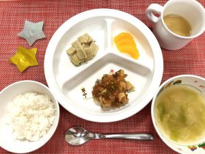 サンライズキッズ保育園 ◎給食の様子 高野豆腐は、食べ慣れない食材のひとつですがカルシウムも豊富な食...