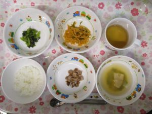 2018-08-06 本日のお給食 Category:給食ピックアップ 8月6日(月)のこんだて *いちご組さん、りんご組さん ・ごはん ・みそ汁 ・鶏肉のマーマレード焼き ・スパゲティソテー ・小松菜のおかか和え *もも組さん(完了食) ・ごはん ・みそ汁 ・鶏肉のマーマレード焼き(きざみ) ・スパゲティソテー(きざみ) ・小松菜のおかか和え(きざみ)