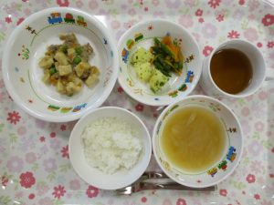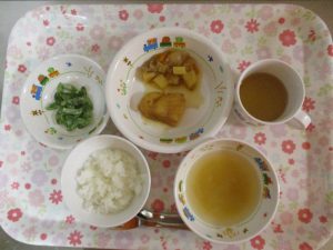 8月16日(木)のこんだて *いちごぐみさん・りんごぐみさん* ・ごはん ・みそ汁 ・高野豆腐の煮物...