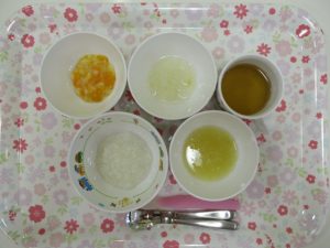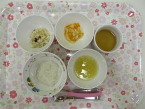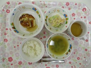 2019-04-17 本日のお給食 Category:給食ピックアップ 4月17日(水)のこんだて *ももぐみさん(中期) ・10倍かゆ ・キャベツのみそ汁 ・たまねぎのやわ煮 ・ゆで野菜 *ももぐみさん(後期) ・5倍かゆ ・キャベツのみそ汁 ・豆腐のつくね焼き ・ゆで野菜 *いちごぐみさん・りんごぐみさん ・ごはん ・キャベツのとわかめのみそ汁 ・豆腐のつくね焼き ・ポテトサラダ