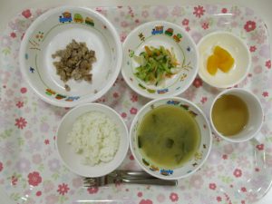 2019-04-26 本日のお給食 Category:給食ピックアップ 4月26日(金)のこんだて *ももぐみさん(中期) ・10倍がゆ *ももぐみさん(後期) ・5倍がゆ ・みそ汁(じゃがいも・たまねぎ) ・そぼろ煮 ・おかか和え *いちごぐみさん・りんごぐみさん ・ごはん ・みそ汁(じゃがいも・たまねぎ・わかめ) ・豚肉の生姜焼き ・もやしのナムル ・オレンジ