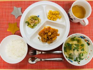 サンライズキッズ保育園 ◎給食の様子 今日は、カレーのいい匂いが園内に広がりカレーライスかなと思った...