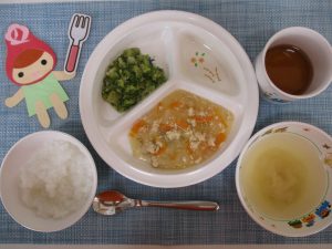 (写真は離乳後期食です。年齢によって形、固さ、盛り付け量を変えて提供しています。)