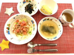 今日は、タコライスでした。お野菜が苦手な子も頑張って食べていました♪まだまだ成長中の小さくてかわいい子どもたちは、食べ慣れない食材も何度か出してみると不思議と食べてくれたりもします♪