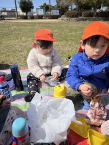 噴水公園ではまずは、みんなで朝のおやつを食べました🍘