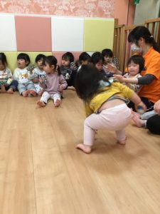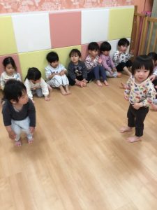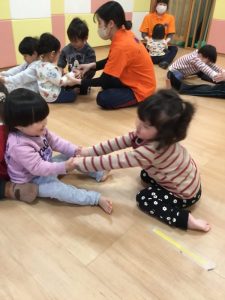 「おふねはぎっちらこ ぎっちらこ ぎっちらこ…♪」お友だち同士で手を繋いでお船を作りユラユラと前後に揺れます🌊🛳