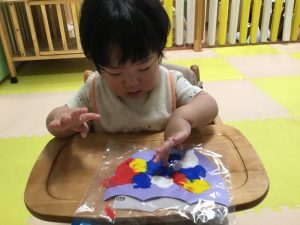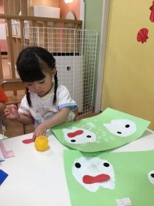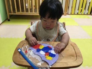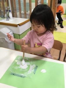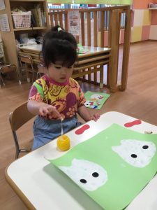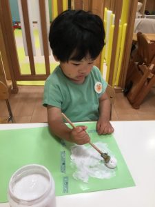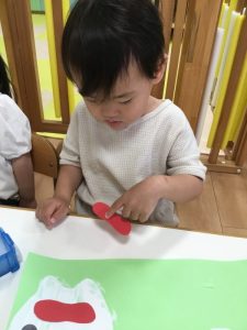色や形を楽しみながら、絵の具やのりなど指先を動かして手先の器用さも育んでいますよ!