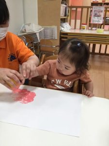 手で色を広げたり、混ぜたりする中で、色の変化や感触を楽しんでいますよ!