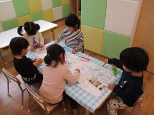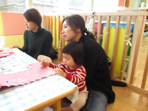 お歌を歌ったり、くつ下の製作でお絵描きやひも通しをしたり![]()