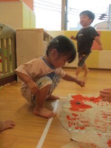 今日はいちご組さんともも組さんと一緒に、三角に切った黒い折り紙を貼っていきます。