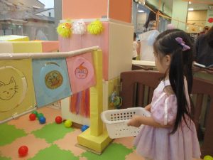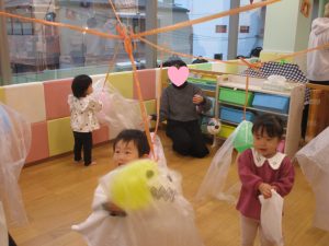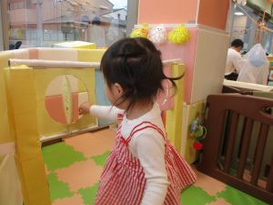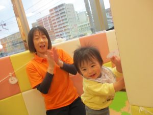 壁に貼られたハロウィン飾りを上手にとれるかな??![]()