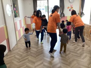 リトミックを行うことが初めてな園児さんも不思議そうにしながらも見よう見まねで楽しもうとする姿が見られました。