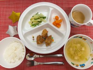 ◎給食の様子 今日は、特別な誕生日メニューでした。鶏の唐揚げもおいしいーっと嬉しそうに食べていました...