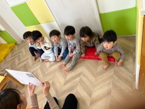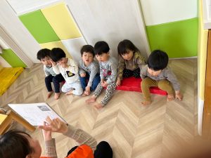 紙芝居は大きな絵やページを引く演出も合わさり、普段見ている絵本とはまた違った楽しさがあるので子どもたちも大好きなんです💕