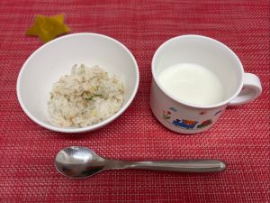 (写真は後期食です。月齢によって形、固さ、盛り付け量を変えて提供しています。)