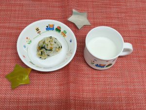 (写真は離乳食後期です。年齢によって形、固さ、盛り付け量を変えて、提供しています。)